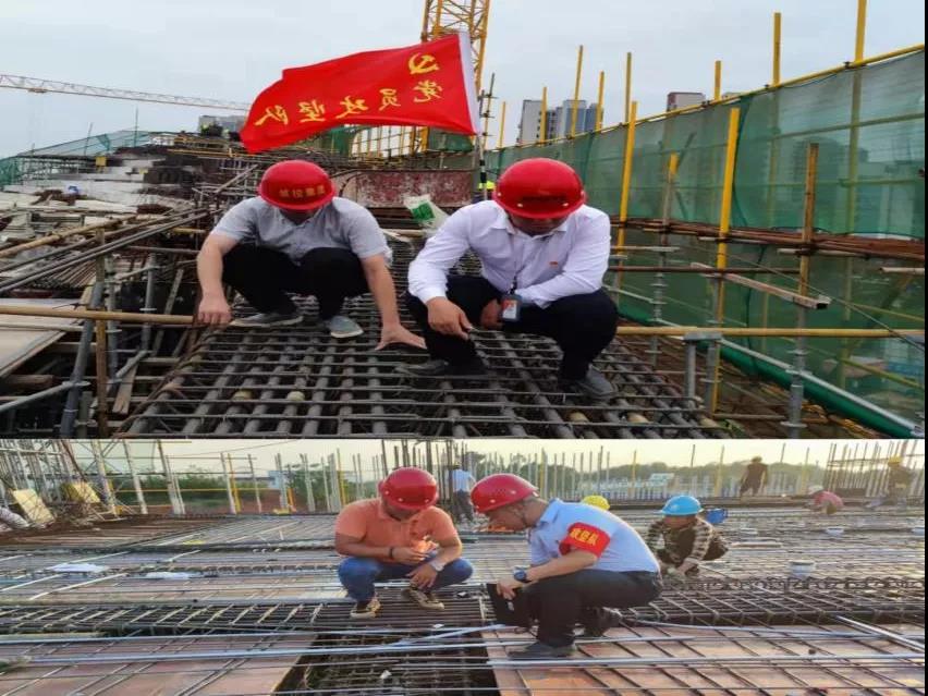 項目部在柱頂環(huán)梁模板支撐體系搭設、鋼筋綁扎攻堅中,遇到了斜梁鋼筋交叉、節(jié)點處鋼筋極密的特殊情況,同時,柱頂環(huán)梁超重超高,且為雙曲面結構,施工難度大、定位難度大。為破解這些難題,工程管理公司派駐項目部的黨員精心組織各參建單位,積極實施“支部建在項目上、黨旗飄在陣地上、黨員沖在一線上”的項目黨建工作法,在施工過程中,臨時聯(lián)合黨支部黨員及參建各方全程監(jiān)督旁站,實現(xiàn)全過程安全、質量管控,達到了預期計劃目標。