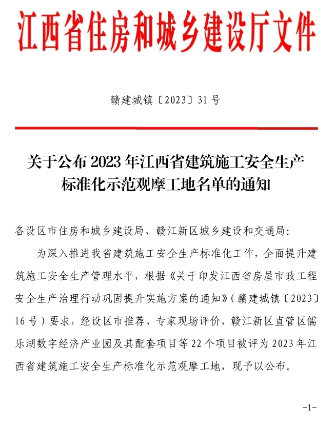 日前,贛州城投集團星洲九樾等2個項目獲評2023年江西省建筑施工安全生產(chǎn)標(biāo)準(zhǔn)化示范觀摩項目。