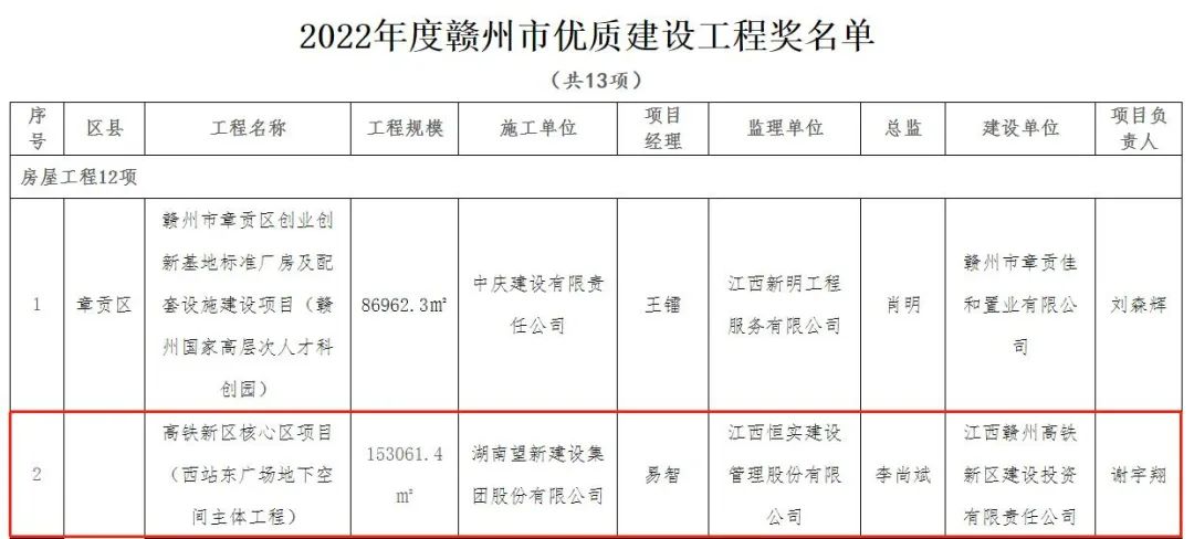 由贛州城投集團(tuán)負(fù)責(zé)建設(shè)實(shí)施的高鐵新區(qū)核心區(qū)項(xiàng)目(西站東廣場地下空間主體工程)榮獲贛州市優(yōu)質(zhì)工程獎(jiǎng),由集團(tuán)組織實(shí)施的市委黨校新建學(xué)員教學(xué)樓建設(shè)項(xiàng)目等4個(gè)項(xiàng)目榮獲2022年上半年贛州市工程質(zhì)量管理標(biāo)準(zhǔn)化示范工地榮譽(yù)稱號(hào)。