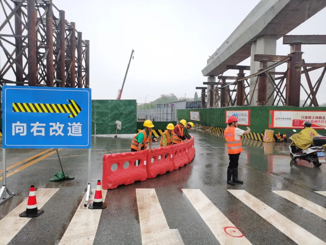 交通安全維護(hù)是項目施工的重中之重。為在確保施工安全和進(jìn)度的前提下,最大限度減少項目建設(shè)對交通的影響,贛州城投集團(tuán)項目部工作人員迅速行動,召集施工、監(jiān)理等單位討論編制創(chuàng)業(yè)路橋梁上跨崗邊大道的交通導(dǎo)行方案。為保證交通導(dǎo)行方案的可行性,項目部邀請交警部門、龍泉村村民到現(xiàn)場踏勘,聽取意見、建議,并對方案進(jìn)一步優(yōu)化、完善。經(jīng)交警部門審批方案通過后,項目部集中力量抓住4月10日和11日周末兩天的空檔期,加班加點完成了跨崗邊大道區(qū)域的交通導(dǎo)行及圍擋,并在后續(xù)施工中安排了專人對車輛、行人進(jìn)行引導(dǎo),對隱患及時排查整改,派駐安全引導(dǎo)員在學(xué)生上下課時間點到路口對通行車輛、行人進(jìn)行引導(dǎo),護(hù)航創(chuàng)業(yè)路三標(biāo)上跨崗邊大道橋梁施工階段的原有地面道路社會車輛及行人有序通行。