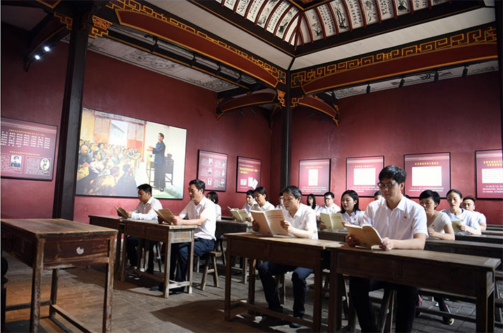 在興國縣蘇維埃政府所在地——瀲江書院,毛主席在這里舉辦了興國縣土地革命干部訓練班,為中央蘇區(qū)的土地革命培養(yǎng)了第一批斗爭骨干,建立了興國縣第一個革命政權。大家在土地革命干部訓練班舊址學堂內,集體誦讀了一段土地革命時期的歷史,當朗朗書聲再次在書院響起,珍貴的革命記憶浮于腦海,激勵黨員們延續(xù)紅色根脈、傳承紅色基因。