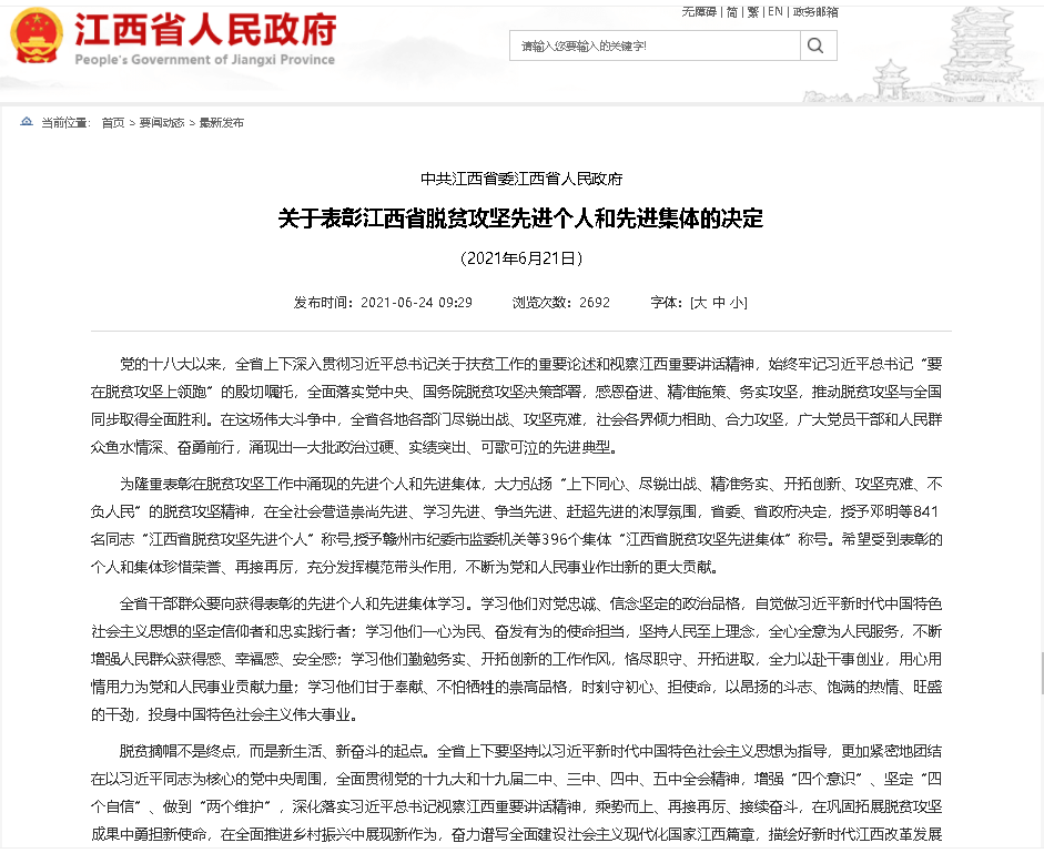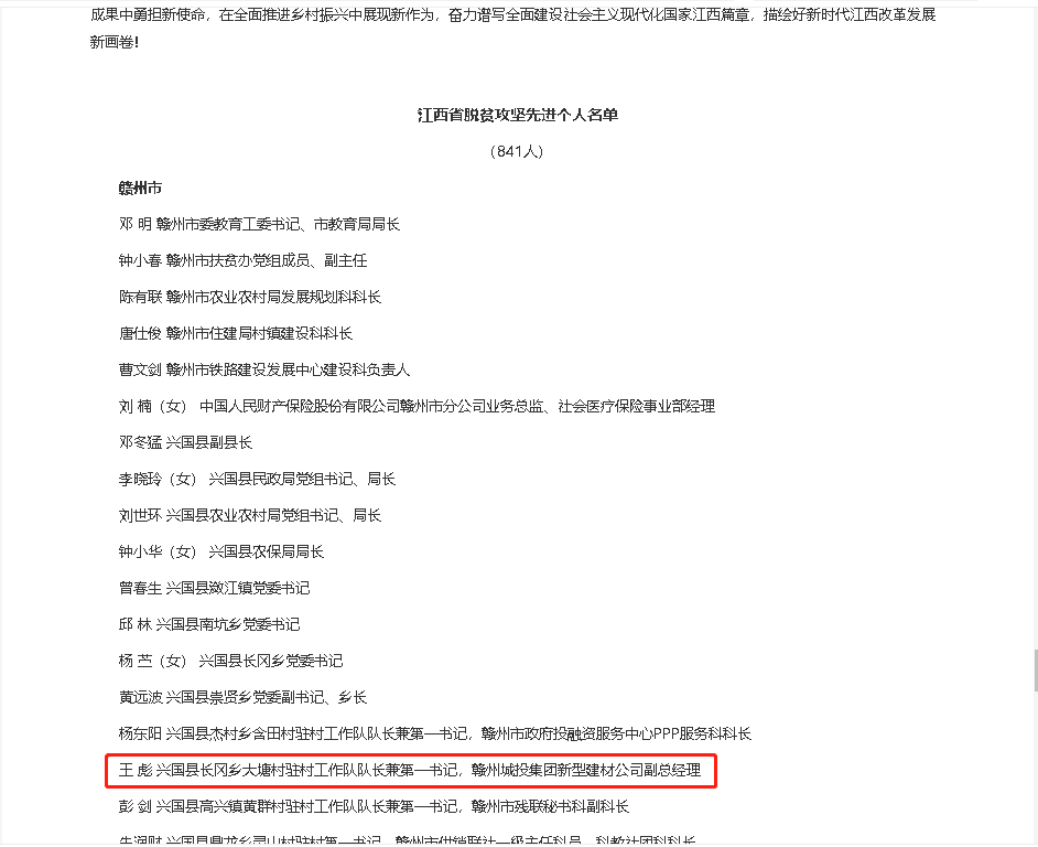6月23日,省委、省政府召開全省脫貧攻堅總結(jié)表彰大會,表彰一批在打贏脫貧攻堅戰(zhàn)中作出突出貢獻(xiàn)的個人和集體,其中,興國縣長岡鄉(xiāng)大塘村駐村工作隊隊長兼第一書記,贛州城投集團(tuán)新型建材公司副總經(jīng)理王彪獲“江西省脫貧攻堅先進(jìn)個人”榮譽(yù)稱號。