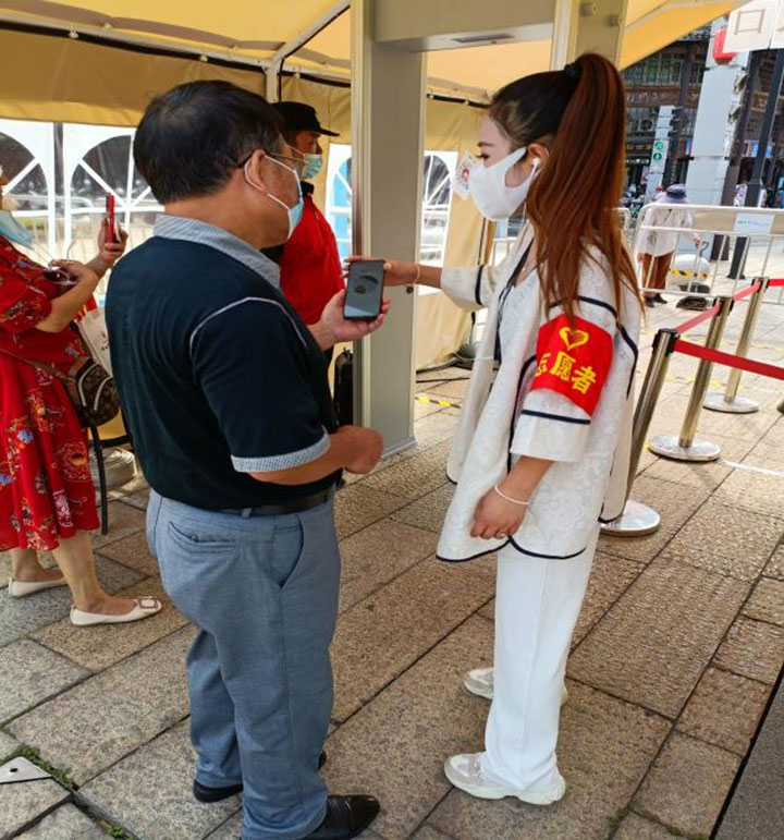 土地置業(yè)公司的志愿者在江南宋城歷史文化旅游區(qū)值班值守,引導(dǎo)廣大游客疫情期間掃碼入場,積極佩戴口罩,做好安全旅游防護(hù)措施。