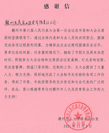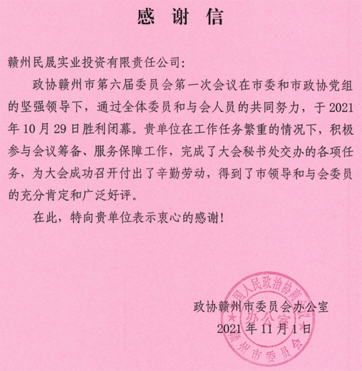 這次圓滿完成市“兩會”會務(wù)保障工作,并獲得市人大、市政協(xié)感謝信表揚(yáng),是對集團(tuán)上下講政治、講擔(dān)當(dāng)、講大局的認(rèn)可與褒獎。第三屆世界贛商大會召開在即,大會開幕式將在贛州大劇院舉辦,民晟實業(yè)公司等相關(guān)單位將再接再厲,熱情服務(wù)好各界賓朋,充分展示新時代國企的擔(dān)當(dāng)作為。