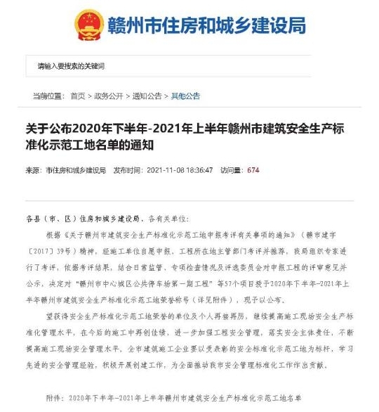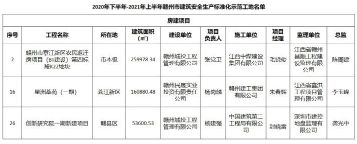 日前,贛州市住房和城鄉(xiāng)建設(shè)局公布了2020年下半年-2021年上半年贛州市建筑安全生產(chǎn)標準化示范工地名單,由贛州城投集團建設(shè)的贛州市章江新區(qū)農(nóng)民返遷房項目(BT建設(shè))第四標段K22地塊、星洲萃苑(一期)、中科院贛江創(chuàng)新研究院一期新建項目共3個項目獲獎。