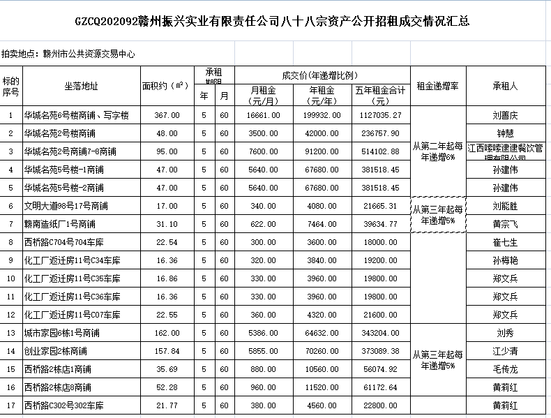 2020年11月25日上午10時,在贛州市公共資源交易中心舉行的贛州振興實業(yè)有限責(zé)任公司八十八宗資產(chǎn)公開招租(項目編號:GZCQ202092),現(xiàn)將公開招租成交情況公示如下: