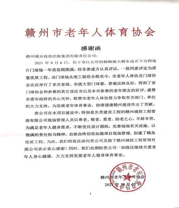 近日,贛州市老年人體育協(xié)會(huì)向贛州城投集團(tuán)送來了一封感謝信,信中對(duì)贛州城投集團(tuán)及下屬工程管理公司關(guān)心關(guān)愛老年人身體健康,大力支持老年人健身體育事業(yè)表示感謝。