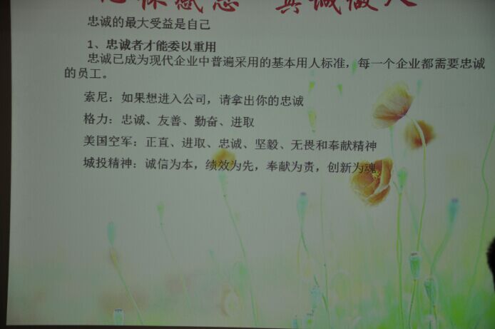 我們城投精神的16字方針:誠信為本,績效為先,奉獻(xiàn)為責(zé),創(chuàng)新為魂。誠信其中一個表現(xiàn)就是忠誠。