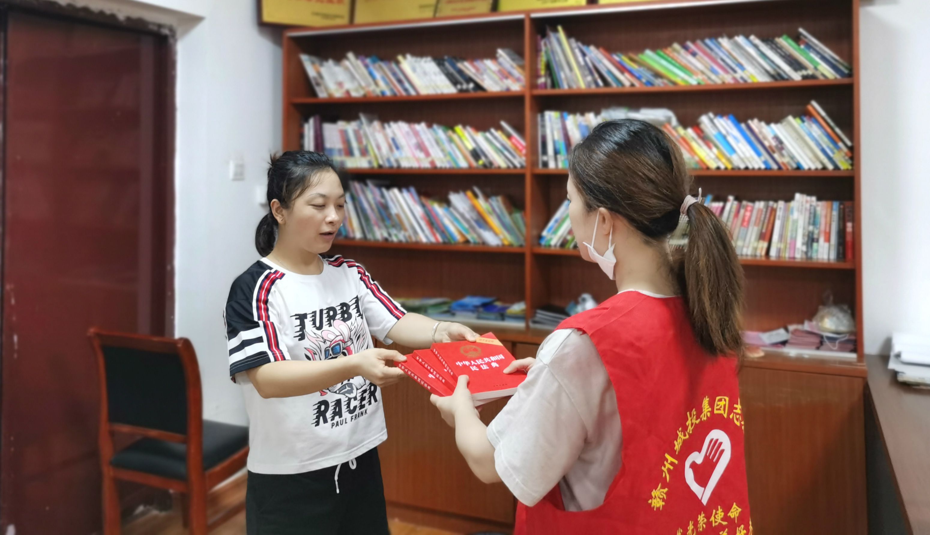 (上圖為7月9日贛州城投集團(tuán)志愿者為社區(qū)書屋捐贈《民法典》)